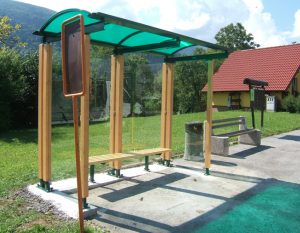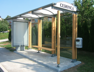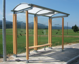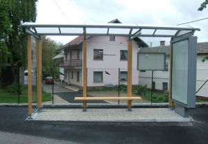 Sie sind hier: Start / Lesnik / Urbane Einrichtungen / Lesnik Bushaltestellen, Fahrradüberdachung und Reklametafeln / Bushaltestelle Stahlkonstruktion mit massiven Holz verkleidet